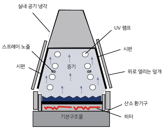 ¸¹Àº ¿Á¿Ü Á¶°Ç¿¡¼ Àç·á´Â ÇÏ·ç 12½Ã°£ ÀÌ»ó ½À±â¿¡ ³ëÃ⠵˴ϴÙ. ¿¬±¸¿¡ µû¸£¸é ÀÌ·¯ÇÑ ¿Á¿Ü ½À±â Á¶°ÇÀÇ ÁÖ ¿øÀÎÀº ºñ°¡ ¾Æ´Ï¶ó À̽½ÀÔ´Ï´Ù. QUV´Â °íÀ¯ÀÇ ÀÀÃà ¸ÞÄ¿´ÏÁòÀ» ÅëÇØ À̸¦ ½Ã¹Ä·¹ÀÌ¼Ç ÇÕ´Ï´Ù. ½ÀÀ± »çÀÌŬÀº ½ÃÇè±â ÇÏ´ÜÀÇ ¹° ÅÊÅ©¸¦ °¡¿ÇÏ¿© Áõ±â¸¦ ¹ß»ý½Ãŵ´Ï´Ù. ¶ß°Å¿î Áõ±â´Â ½ÃÇè±â è¹ö¸¦ ³ôÀº ¿Âµµ¿¡¼ »ó´ë½Àµµ 100%·Î À¯Áö½Ãŵ´Ï´Ù. QUV´Â ½ÃÆíÀÌ ½ÃÇè è¹öÀÇ ¿Üº® ¿ªÇÒÀ» Çϵµ·Ï ¼³°èµÇ¾î ÀÖ½À´Ï´Ù. ±×·Î ÀÎÇØ ½ÃÆíÀÇ µÞ¸éÀº ÁÖº¯ °ø±â¿¡ ³ëÃâµË´Ï´Ù. ÀÌ·¯ÇÑ ½Ç³» °ø±â¸¦ ÀÌ¿ëÇÑ ³Ã°¢ ¹æ½ÄÀº ½ÃÆíÀÇ ¿ÜºÎ Ç¥¸é ¿Âµµ¸¦ ³»ºÎ ¿Âµµº¸´Ù ³·°Ô ÇÏ¿© ¹°ÀÌ ½ÃÆí Ç¥¸é¿¡ ÀÀÃàµÇ°Ô ÇÕ´Ï´Ù. Áõ¹ß °úÁ¤Àº ÀÚ¿¬½º·´°Ô ¹°À» Áõ·ùÇÏ¿© ÀÏ¹Ý ¼öµ¾¹°À» »ç¿ëÇÏ¿©µµ ½ÃÆí Ç¥¸é¿¡´Â ¼ø¼öÇÑ ¹°ÀÌ ¸ÎÈ÷°Ô ÇÕ´Ï´Ù.