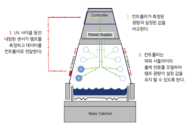ºûÀÇ °µµ º¯È´Â ¹°ÁúÀÇ ¼Õ»ó ÁøÇà °úÁ¤¿¡ ¿µÇâÀ» ÁÝ´Ï´Ù. ½ºÆåÆ®·³ÀÇ º¯È´Â ¼Óµµ¿Í ¼Õ»ó À¯Çü ¸ðµÎ¿¡ ¿µÇâÀ» ÁÝ´Ï´Ù. µû¶ó¼ ³»±¸¼º ½ÃÇè±â´Â ÀçÇö¼ºÀ» À§ÇØ Á¶µµÁ¦¾î°¡ °¡´ÉÇØ¾ß ÇÕ´Ï´Ù. ´ëºÎºÐÀÇ QUV ¸ðµ¨Àº SOLAR EYE Á¶µµ Á¦¾î ±â¼úÀÌ ³»ÀåµÇ¾î ÀÖ½À´Ï´Ù. SOLAR EYE´Â Çǵå¹éÀ» ÅëÇØ ±¤·®À» ÀÚµ¿ÀûÀ¸·Î Á¤¹Ð Á¦¾îÇÏ´Â ½Ã½ºÅÛ ÀÔ´Ï´Ù. ÄÁÆ®·Ñ·¯´Â UV °µµ¸¦ ¸ð´ÏÅÍÇÏ¿© ·¥ÇÁ Àü·ÂÀ» Á¶Á¤Çϸç, ·¥ÇÁ ³ëÈÄÈ ¹× ±âŸ º¯µ¿¼ºÀ» º¸»óÇÕ´Ï´Ù. SOLAR EYE ½Ã½ºÅÛÀº ¼öµ¿ ½Ã½ºÅÛ¿¡ ºñÇØ ÀçÇö¼º°ú ¹Ýº¹¼ºÀÌ ¶Ù¾î ³³´Ï´Ù.