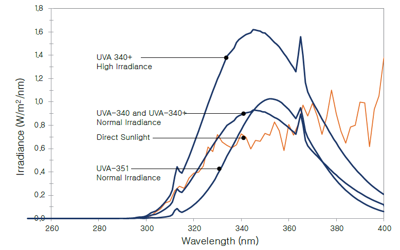 UVA-340 ·¥ÇÁ´Â žçÀÌ °¡Áö´Â 365nm~295nm(´ë±â±Ç Ç¥¸é¿¡ ¶³¾îÁö´Â ÃÖÀúÁ¡ ´ÜÆÄÀå) ºûÀ» Á¶»çÇÕ´Ï´Ù. UVA-340+(plus) ·¥ÇÁ´Â »ó´ç¼öÀÇ ½ÃÇè±Ô°Ý¿¡¼ ¿ä±¸ÇÏ´Â ÃÖ´ëÄ¡ ºûÀÇ Á¶»ç·®ÀÎ 1.70W/m©÷/nm°¡ °¡´ÉÇϰí, UVA-351·¥ÇÁ´Â âÀ» ÅëÇØ µé¾î¿À´Â ÇÞºûÀÇ ½Ã¹Ä·¹À̼ÇÀ» ÇÒ ¼ö ÀÖ½À´Ï´Ù. ÀÏ¹Ý »ç¹«½Ç ȯ°æÀÇ ºûÀ» ½Ã¹Ä·¹ÀÌ¼Ç Çϱâ À§ÇÑ Cool White Lampµµ °¡´ÉÇÕ´Ï´Ù.
