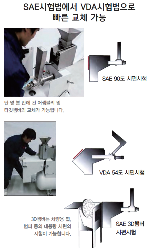 ÃֽŠ´Ù¸ñÀû ºñ¼®½ÃÇè±â Gravelometer·Î °¢Á¾ ÀÚµ¿Â÷ ÀÚÀç ¹× ÄÚÆÃÀç¿¡ ´ëÇÑ ºñ¼® Ãæ°Ý ½ÃÇèÀÌ °¡´ÉÇÕ´Ï´Ù. SAE, ASTM, VDA, GM, Ford, Chrysler, Mazda, JIS, Nissan, VW, Toyota µî¿¡¼ ¿ä±¸ÇÏ´Â ±Ô°ÝÀÇ ½ÃÇèÀÌ ¸ðµÎ °¡´ÉÇϸç, ÇÑ ´ëÀÇ ´Ù¸ñÀû ºñ¼®½ÃÇè±â·Î °ÅÀÇ ¸ðµç ÀÚµ¿Â÷ ¾÷°è¿¡¼ ¿ä±¸ÇÏ´Â ºñ¼®½ÃÇèÀÌ °¡´ÉÇÕ´Ï´Ù. ÁÖ¿ä ±¸¼ºÇ°Àº °Ç ¾î¼Àºí¸®(Gun Assembly), Ÿ±ê è¹ö(Target Chamber) ±×¸®°í ½ÃÆí Ȧ´õ(Specimen Holder)·Î ±¸¼ºµÇ¾î ÀÖ½À´Ï´Ù. ÇÏ·ç¿¡ ¼ö¹é ¹øÀÇ ½ÃÇèÀÌ °¡´ÉÇÏ¸ç ºü¸£°Ô ½ÃÆíÀÇ ÀåÂø ¹× Å»°Å°¡ °¡´ÉÇÕ´Ï´Ù. ¶ÇÇÑ ºñ¼® Box ¸¦ º°µµ·Î À§Ä¡½ÃÄѼ ¾ÆÁÖ Æí¸®ÇÏ°Ô »ç¿ëÇÒ ¼ö ÀÖ½À´Ï´Ù. ºñ¼®½ÃÇè±â´Â ½ÃÇè¹ýÀÇ ¿©·¯ Á¶°ÇµéÀÇ ÄÁÆ®·ÑÀÌ °¡´ÉÇϸç, ISO9000 ÀÎÁõ¿¡ ÀÇÇÑ °Ë±³Á¤ÀÌ °¡´ÉÇÕ´Ï´Ù.